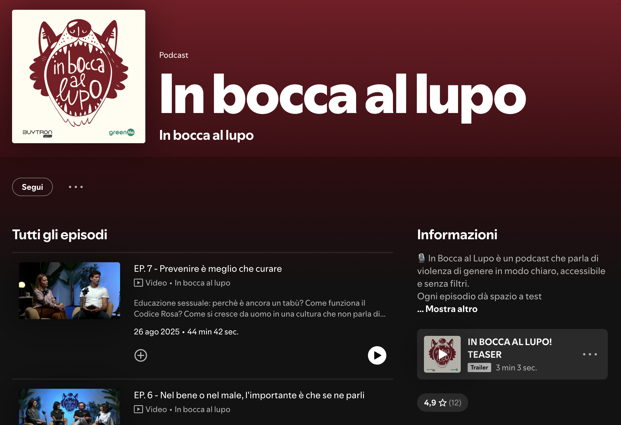 “In Bocca al Lupo” è un podcast che affronta il tema della violenza di genere con un linguaggio diretto, accessibile e autentico. Un progetto editoriale che unisce testimonianze, contributi di esperti e riflessioni collettive per generare consapevolezza e stimolare un cambiamento culturale reale. Non solo storytelling, ma un dispositivo di impatto: uno spazio di ascolto, informazione e attivazione, capace di rompere il silenzio e mettere in discussione narrazioni consolidate.